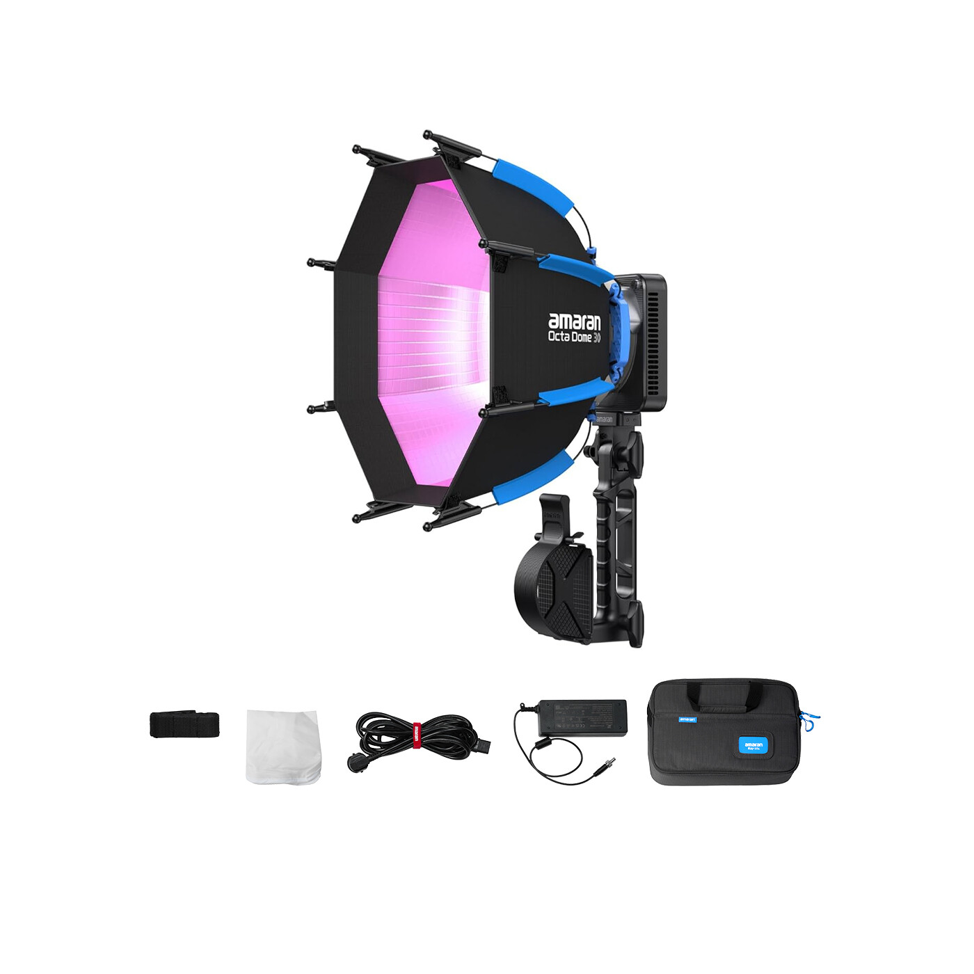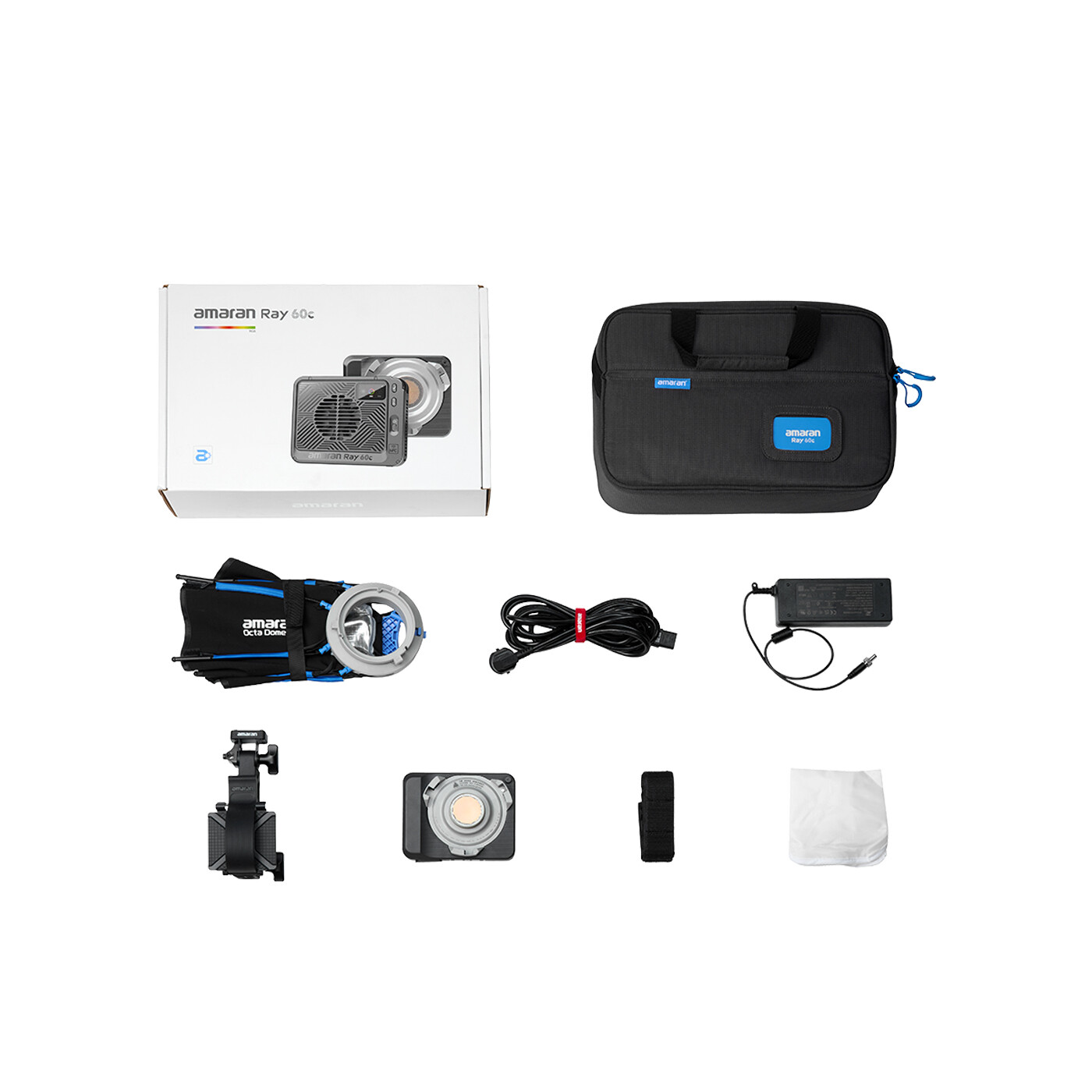 amaran Ray 60c levereras som ett ready-to-shoot kit, inklusive den helt nya amaran Octa Dome 30 softboxen och tillbehör, Ace Lock till Baby Pin Adapter, strömadapter och kabel – allt i en dedikerad väska, så att du har en komplett ljuslösning var du än skapar.