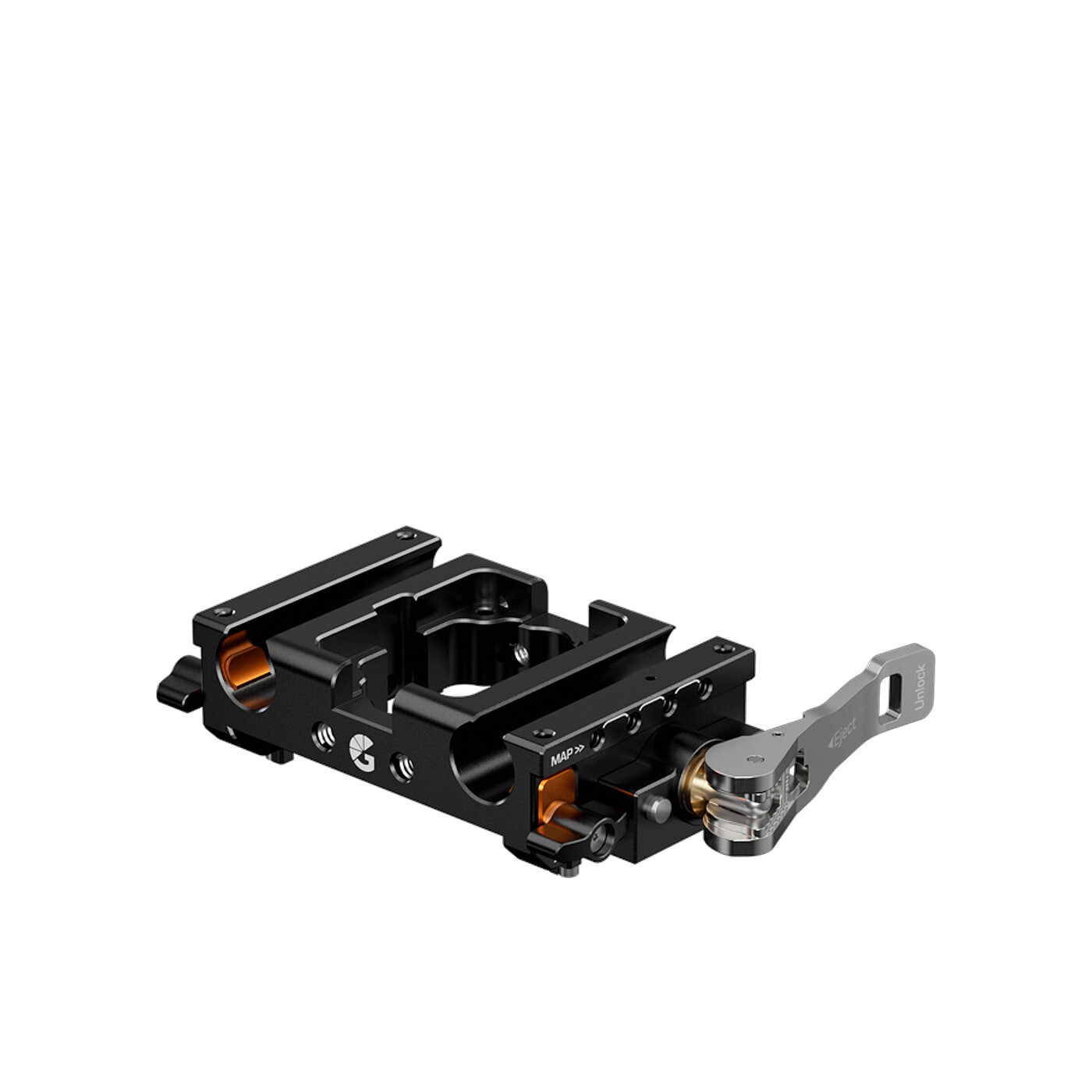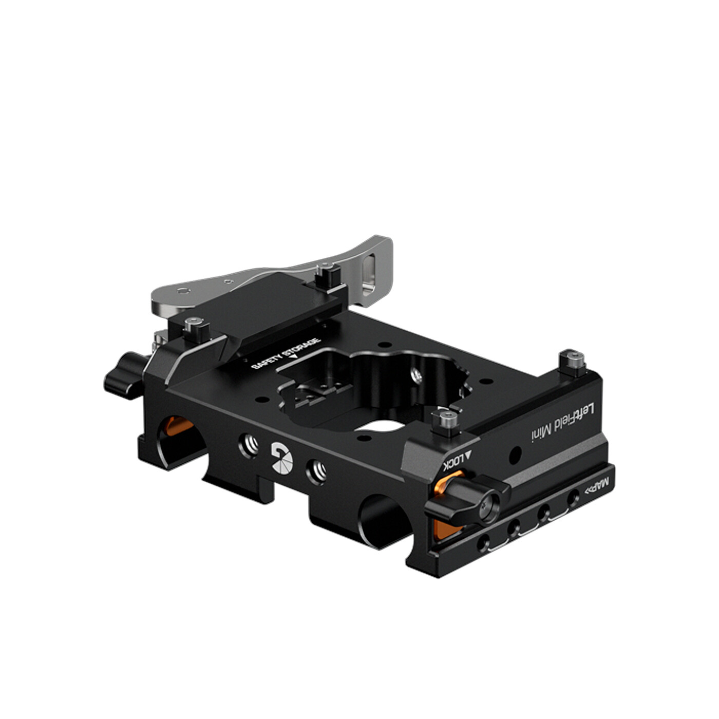 Trots att LeftField Mini är mer kompakt än LeftField 3 Baseplates är den fortfarande utrustad med Bright Tangerines populära Open•UP-system för snabb och smidig quick-release. Det gör att du enkelt kan montera LeftField Mini Baseplate på en standard ARRI-dovetail på några sekunder. När den sitter på plats använder du spaken på sidan för att växla mellan låst, glidande och upplåst läge på dovetailen.