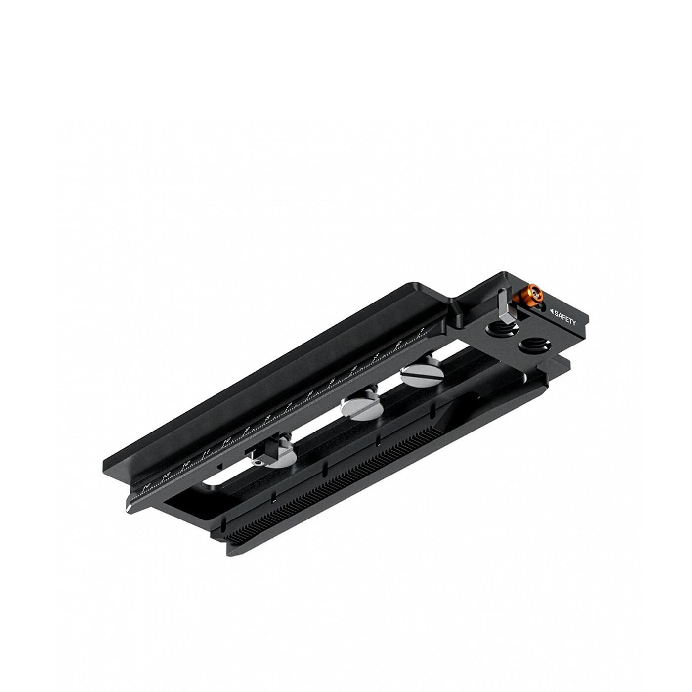 För exakt kameraplacering är Universal Dovetail lasergraverad för ökad precision. Markeringar längs sidan av den övre slitsen hjälper till att hålla kameran rak, och millimetermarkeringar gör balanseringen enklare. Den främre safety stop är dessutom markerad i Bright Tangerines karakteristiska orange färg för god synlighet.