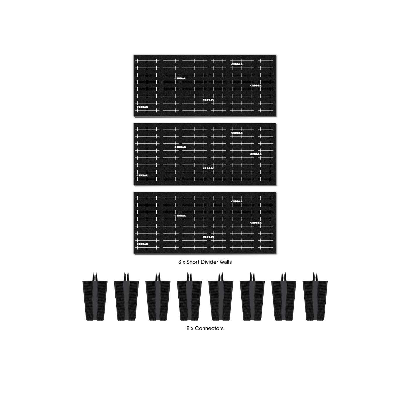 Uppgradera ditt GRID-DIVIDE Carry On Universal Kit med detta kompletta short-wall expansion set. Paketet innehåller tre Velcro-kompatibla skiljeväggar och åtta robusta kopplingar för att skapa nya fack och modulära layouter. Varje vägg har en tryckt skärguide för exakt anpassning och omkonfiguration – inget lim, inga begränsningar.