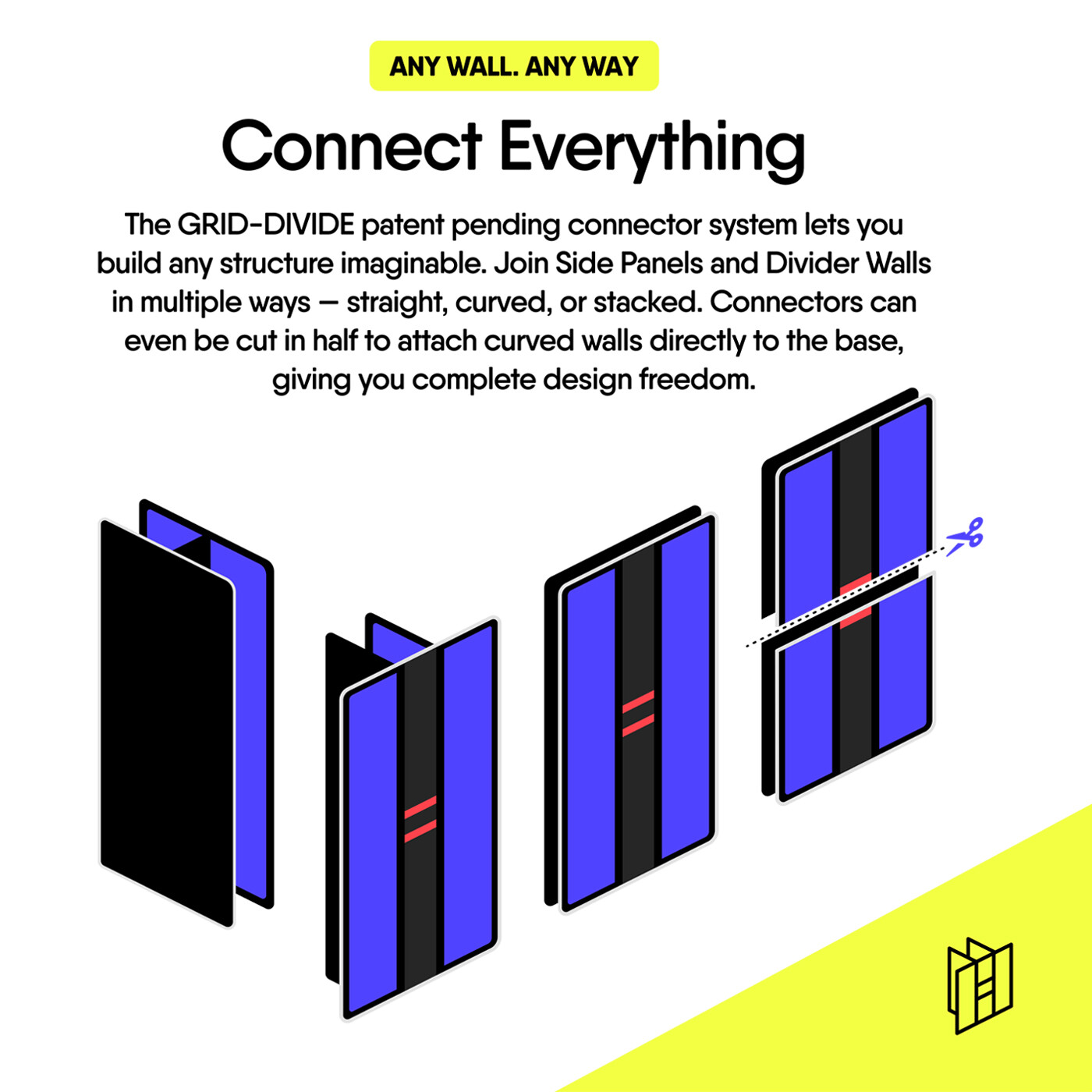 GRID DIVIDE-kopplingssystemet låter dig bygga vilken struktur du vill. Fäst sidopaneler och skiljeväggar på flera sätt – raka, böjda eller staplade. Kopplingarna kan till och med delas på mitten för att fästa böjda väggar direkt mot botten, vilket ger dig full designfrihet.