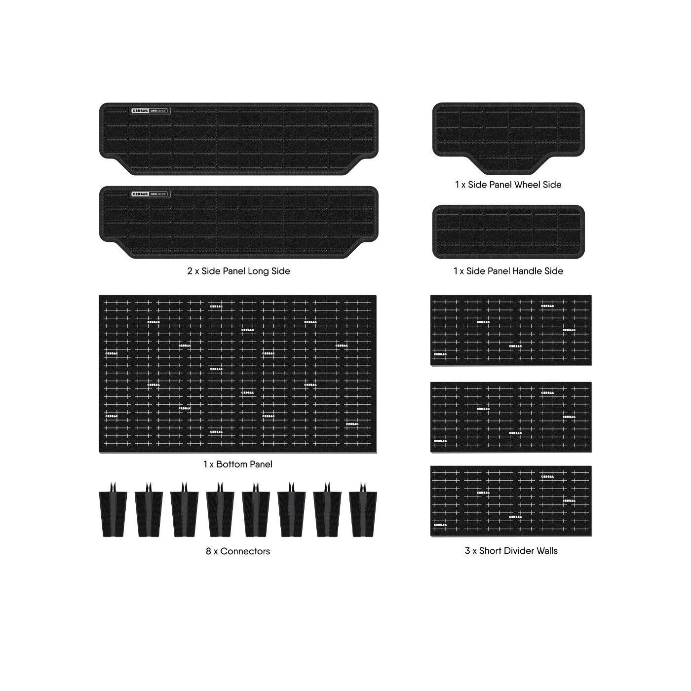 GRID-DIVIDE Carry On Universal Kit har laserskurna loop-paneler, Nylex-fodrade EVA-väggar som kan användas raka eller böjda, samt de patenterade hook & loop-fästena som möjliggör oändliga konfigurationer. Designat för att fungera perfekt tillsammans med GRID LID och CRDPOUCH-serien.