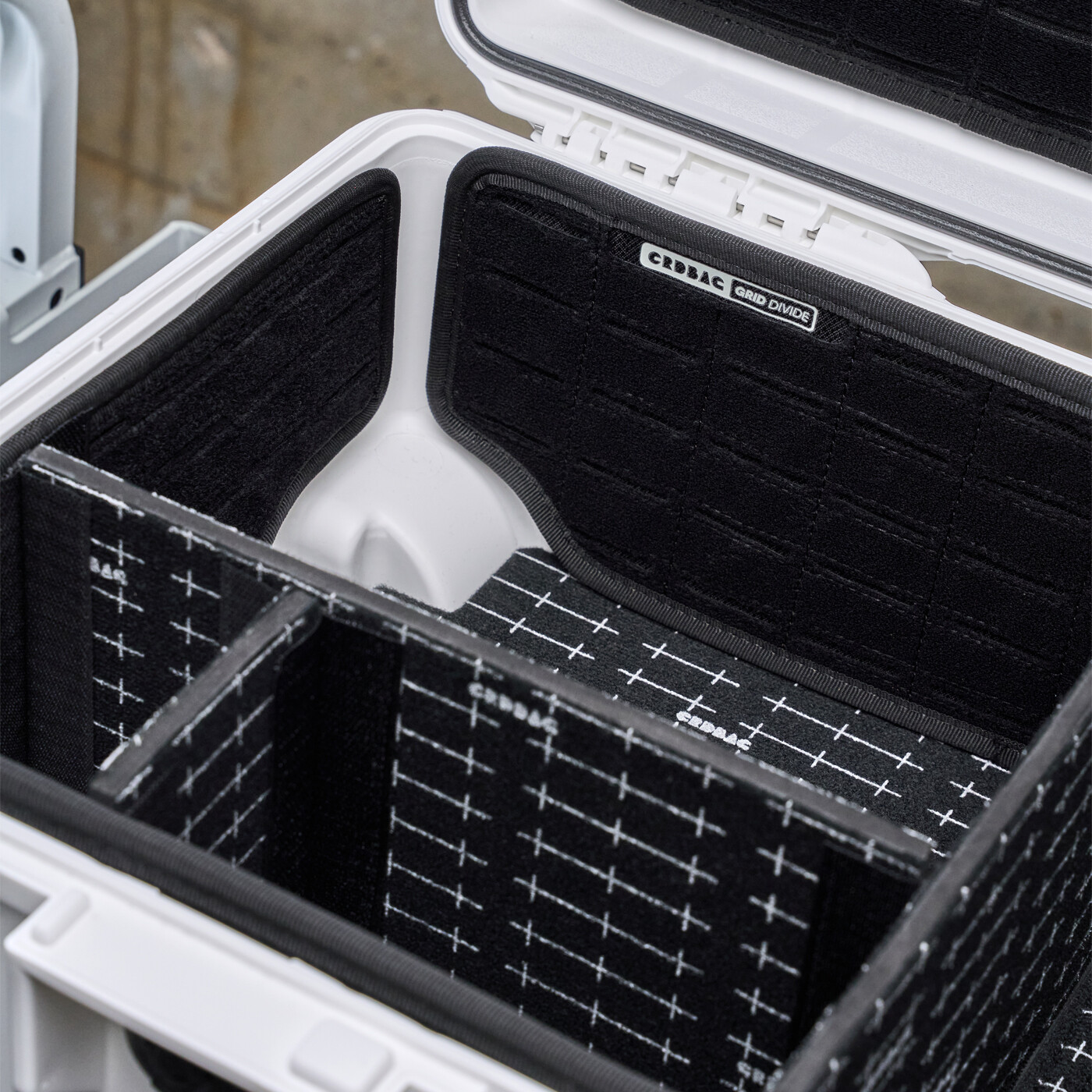 Det patenterade hook & loop-fästsystemet gör det möjligt att fästa väggar golv-till-vägg, vägg-till-vägg eller till och med i vinkel. Tillverkat av lätt EVA-skum täckt med precist utskuret Velcro loop-tyg, integreras GRID DIVIDE sömlöst med MOLLE/PALS-tillbehör, CRDBAG patches och pouches.