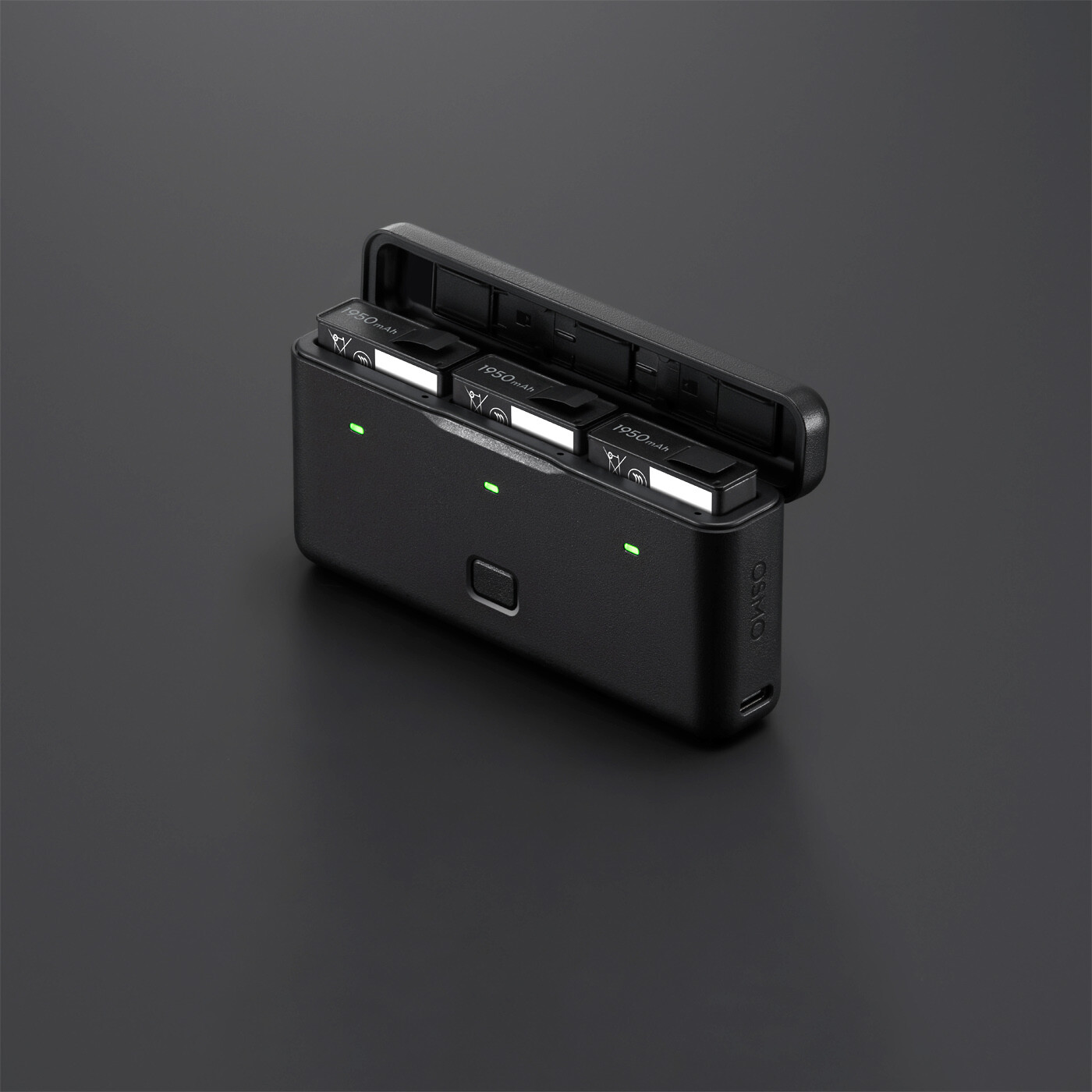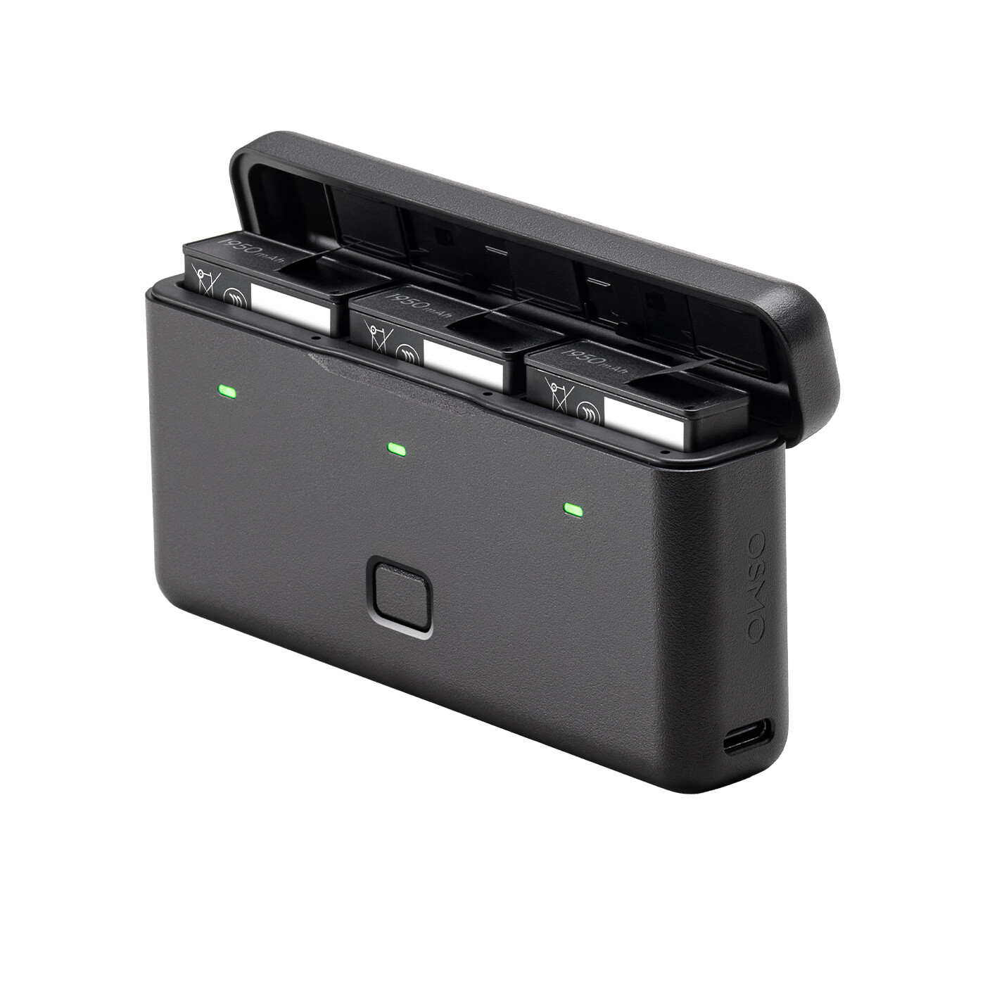 Förvarar tre batterier och två microSD-kort. Laddar intelligent tre batterier med fast charging och kan, tillsammans med batterierna, användas som powerbank för att ladda andra enheter som till exempel din smartphone.