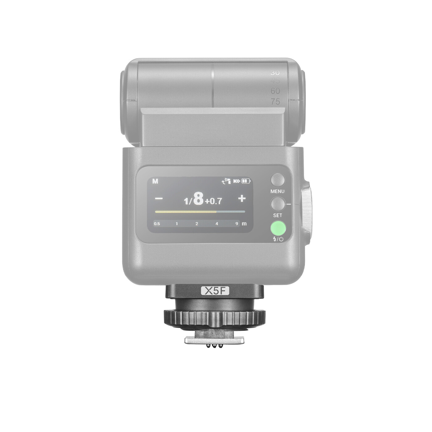 X5 fungerar både som hotshoe-fäste och trådlös sändare och möjliggör en smidig övergång mellan on-camera och off-camera användning. När den är ansluten till iT32 fungerar den som hotshoe för on-camera fotografering; när den kopplas bort växlar den automatiskt till trigger-läge och styr iT32 eller andra Godox Wireless X System-blixtar trådlöst.