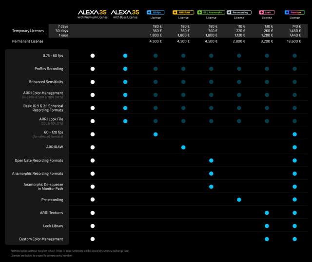 Det eksisterende kamera, med alle dets softwarebaserede funktioner, vil nu være kendt som ALEXA 35 Premium og får selskab af den nye og billigere ALEXA 35 Base-model, som har et grundlæggende sæt funktioner, der kan opgraderes ved behov, via tilkøb af midlertidige eller permanente licenser.