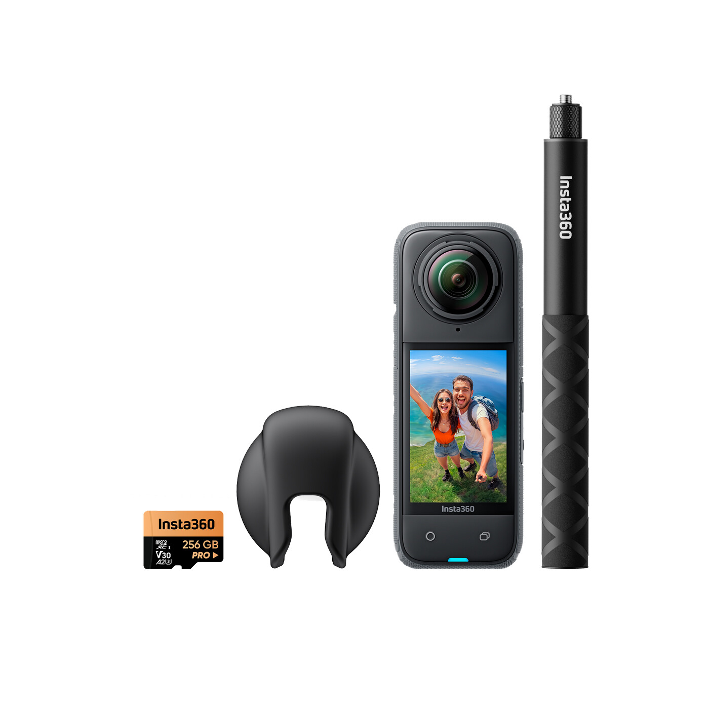Den medföljande 114 cm osynliga selfiesticken hjälper dig att skapa bredare och mer dynamiska inspelningar, medan minneskortet på 256 GB ger gott om utrymme för videor och bilder i hög upplösning. Objektivskyddet ger extra skydd när kameran inte används.