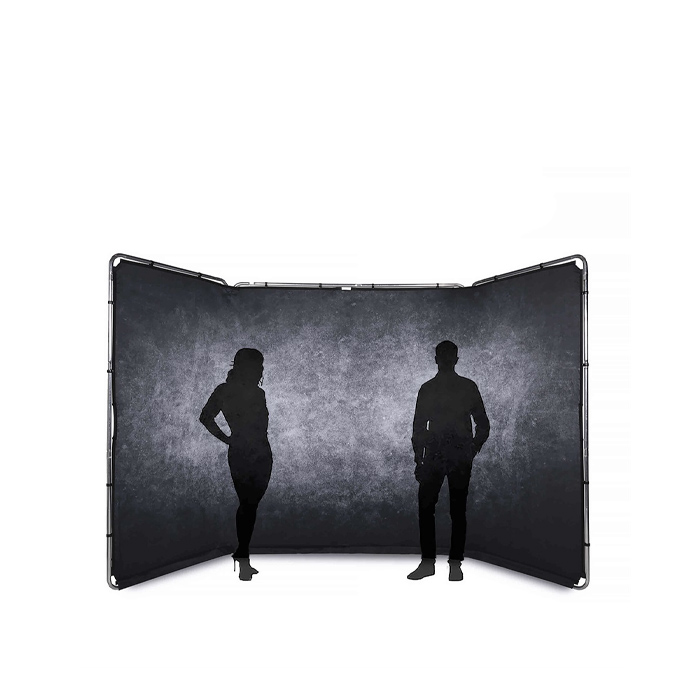 The structure comprises three individual aluminium framed sections, connected together with a hinge clip to allow the background to be set up flat to lean against a wall or with the side frames folded in to create a wraparound effect. The Granite cover just simply clips to the aluminium frame and creates a taught, seamless surface.
