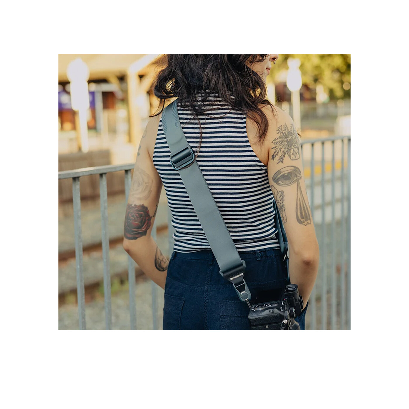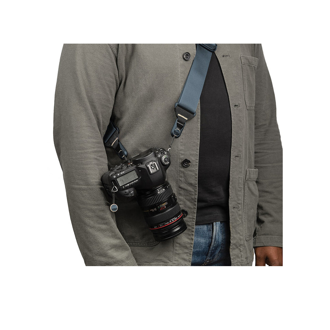 Slide kan bäras som sling strap, neck strap eller shoulder strap. Den invändigt vadderade nylon webbing har en slät sida som glider lätt över kläder i sling-läge samt en greppvänlig sida som förhindrar att remmen glider av axeln i shoulder-läge. Dubbla quick-adjusters ger omedelbar åtkomst och gör det enkelt att anpassa remmen efter olika bärstilar.