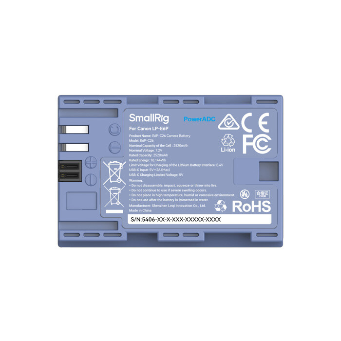 SmallRig E6P-C26 Camera Battery är utrustat med en USB-C-laddningsport som stöder flera laddningsmetoder, inklusive laddning via powerbank, väggladdare, billaddare eller dedikerad laddare, så att du kan ladda när som helst och var som helst. Batteriet använder en högströmslösning med en laddspänning på 5V och en maximal laddström på 2A, vilket möjliggör full laddning på endast 2,5 timmar.