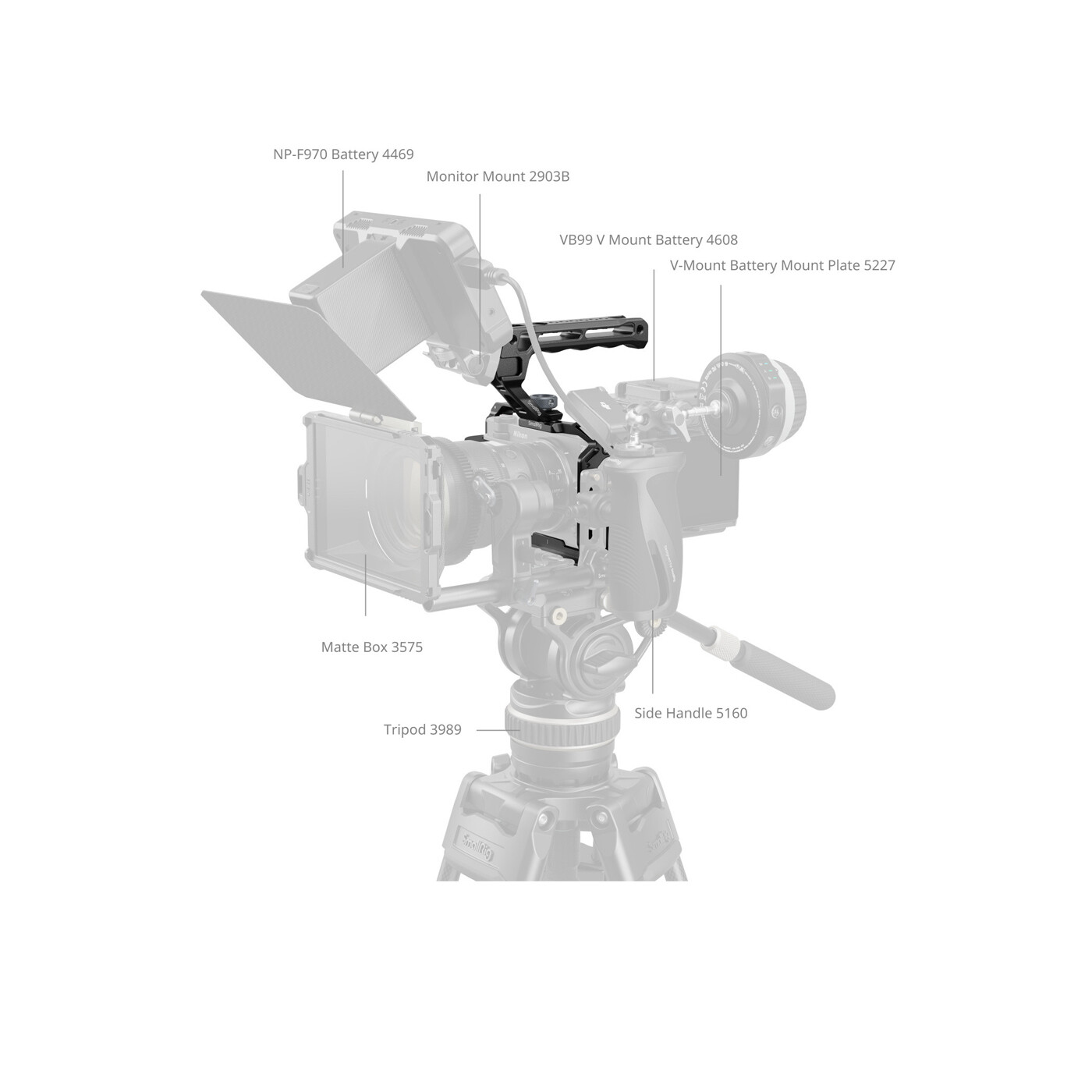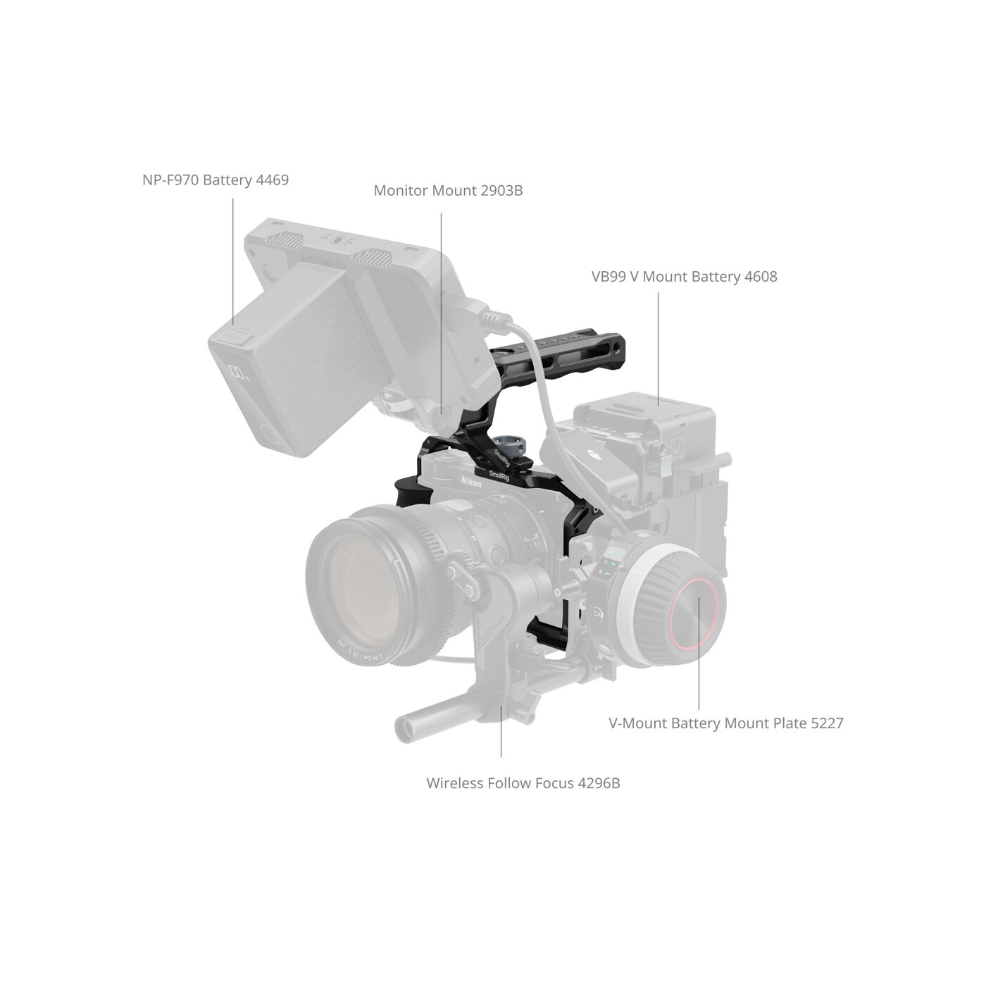 Cagen erbjuder omfattande expansionsmöjligheter, inklusive flera 1/4"-20 gängade hål och locating holes för montering av tillbehör såsom side handles (ID 5532) eller magic arms (ID 5308, 4900). Den har även 3/8"-16 ARRI locating holes för montering av monitor mounts (ID 2903B) eller top handles (ID 5252, 3765). Inbyggda cold shoe mounts möjliggör montering av mikrofoner (kompatibla med DJI MIC 2) eller ljus (ID 4660), medan den nedre QD-sockeln stöder QD-axelremmar (ID 4118B). Dessutom kan remfästen användas för handledsremmar (ID 3848) eller axelremmar (ID 4882, 5208).