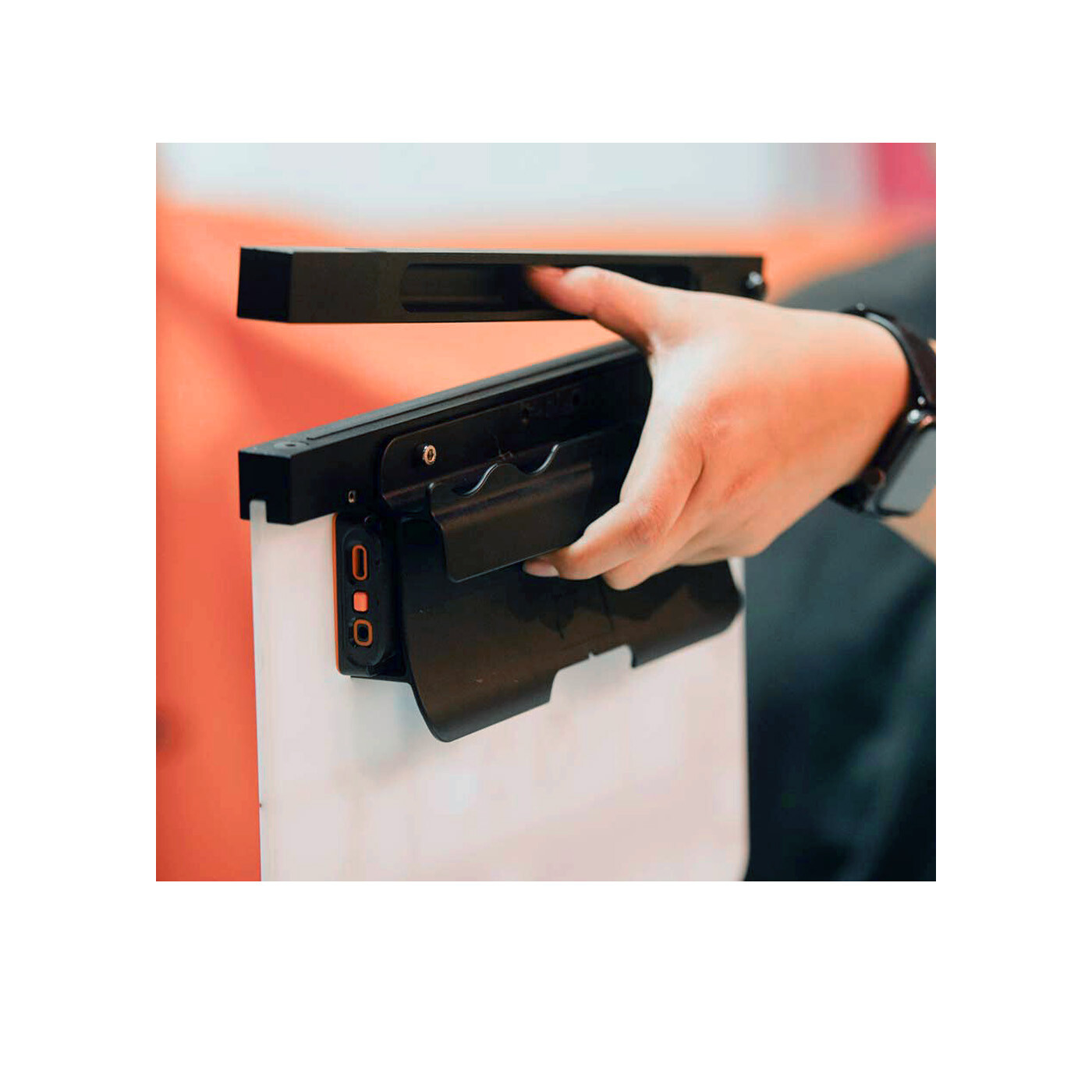 TIMEBAR Timecode Slate allt-i-ett digitala timecode slate-kit, är designat för sömlös integration med hela Tentacle Sync-ekosystemet. Tentacle Sync har samarbetat med premium-slatetillverkaren Filmsticks för att skapa denna unika och mångsidiga lösning. Kitet innehåller TIMEBAR – en multifunktionell timecode-display – tillsammans med en högkvalitativ bräda, clapper sticks och en dedikerad hållare som även fungerar som mount för TIMEBAR. Detta lätta men robusta setup förbättrar både portabilitet och flexibilitet på set. TIMEBAR kan snabbt monteras eller tas bort och kan även användas fristående som timer, meddelandedisplay eller stoppur, oavsett montering, helt styrt via vår Setup App.