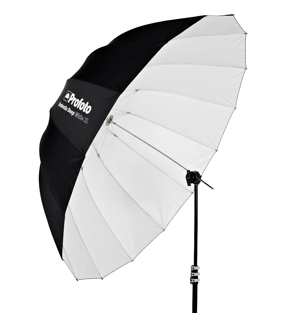 XL paraplyer är populära bland porträtt- och modefotografer. Den skapar ett mjukt men ändå distinkt ljus som tillåter fotografen att belysa en hel person eller till och med mindre grupper av personer med en enda ljuskälla. Den djupare formen ger fotografen bättre kontroll över ljusspridningen. Paraplyet ger också möjlighet att fokusera och kontrollera ljuset genom att enkelt skjuta paraplyet fram och tillbaka i hållaren. Dessutom gör de starka glasfiberspröten Umbrella Deep anmärkningsvärt pålitligt och hållbart. Paraplyet finns i tre varianter: vit, silver och transparent. Det vita paraplyet skapar ett jämt, diffust ljus med mjuka skuggor och ju närmare paraplyet placeras motivet, desto mjukare blir skuggorna.